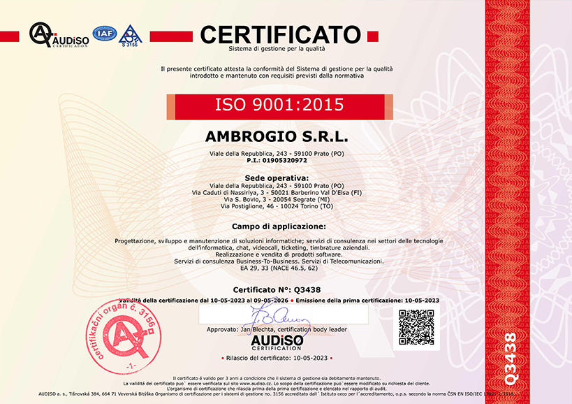 La certificazione ISO 9001 dimostra il nostro impegno nel miglioramento continuo dei processi aziendali, con l'obiettivo di aumentare la soddisfazione del cliente e l'efficienza operativa.